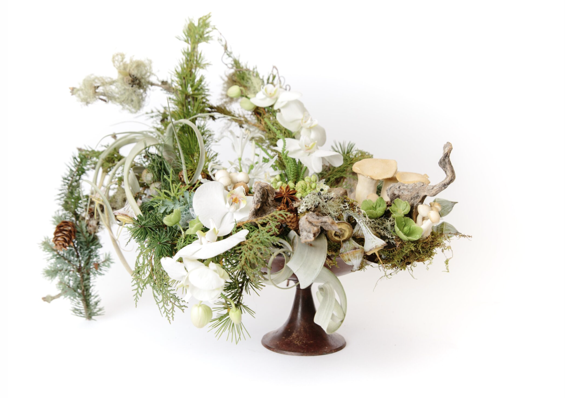 Some seasonal greens are secured to chicken wire; cover the wire with moss, then secure some branches, dehydrated mushrooms, seedpods, lichen, tillandsia xerographica leaves and white phaleonopsis (in water tubes).