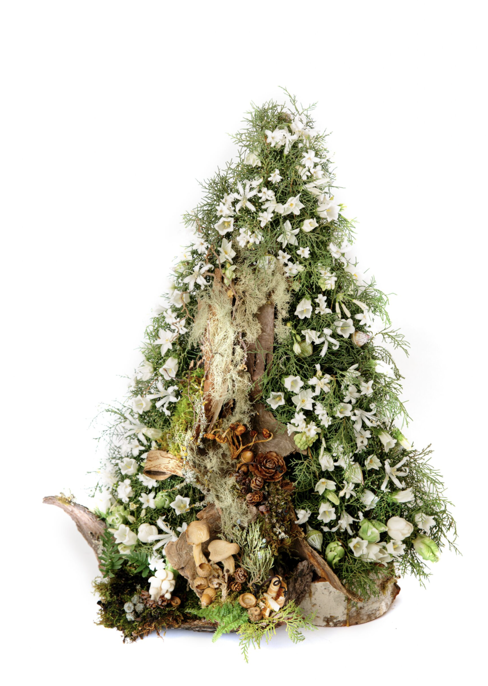 I used a welded triangular structure (you can also make a triangular structure with branches) and secured it to a wooden base. Then I stretched chicken wire in the triangle, covered it with moss and evergreen branches and secured a piece of wood. Campanula and nerine lilies were added in small water tubes. Dehydrated mushrooms, seedpods and other textures were glued to the wood.