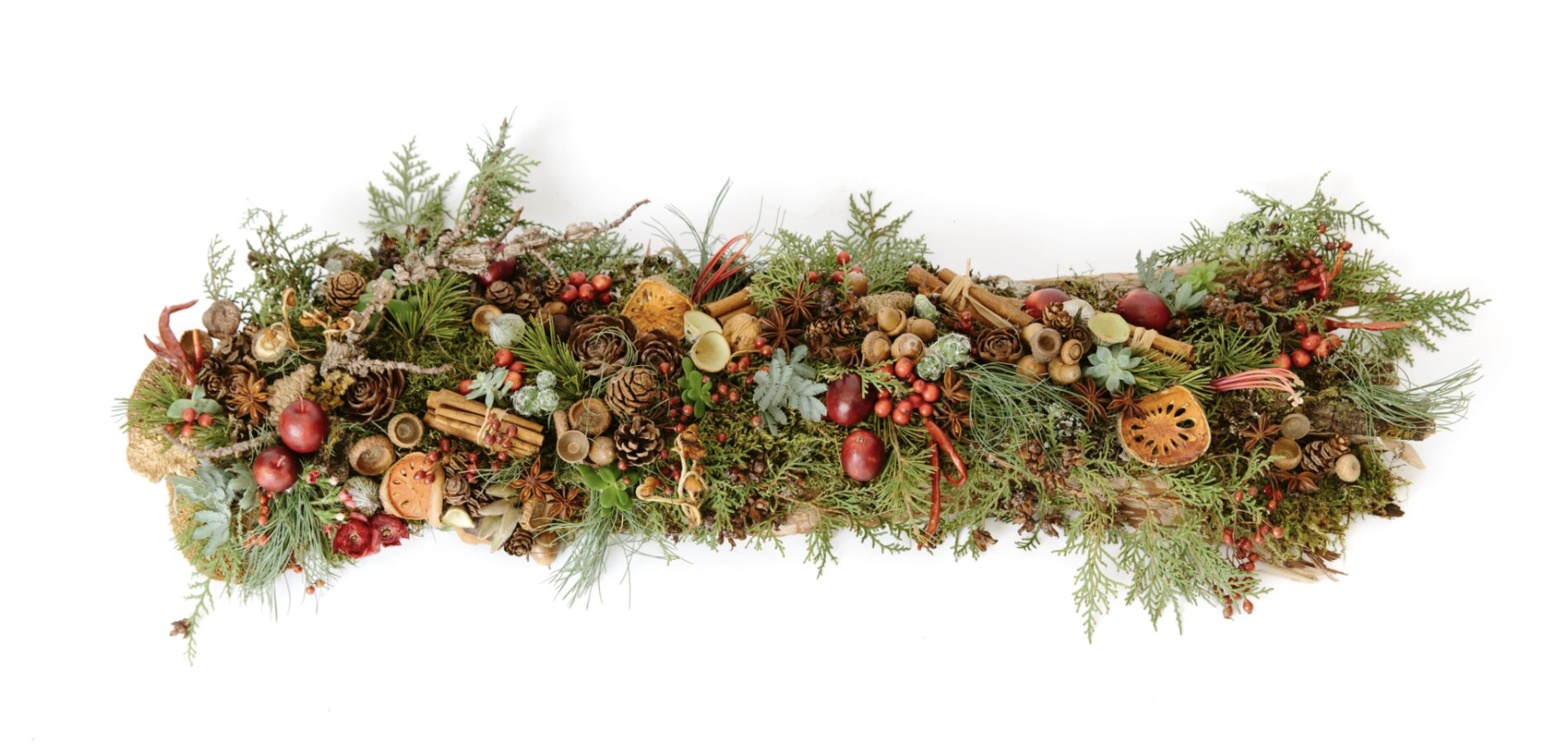 I used a long, very shallow container, and glued a bed of evergreens. Then decorated it with bundles of cinnamon sticks, dehydrated mushrooms and slices of quince and oranges, succulents, seedpods, pinecones, rosehips,…